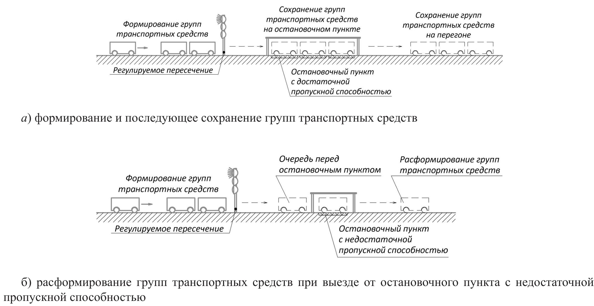 Рисунок 1. Схемы формирования групп пассажирских транспортных средств на участке улично-дорожной сети
