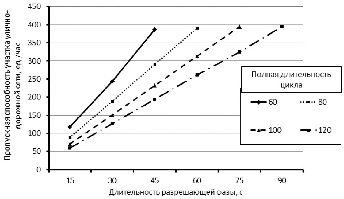 Рисунок 5. Зависимости пропускной способности элементов улично-дорожной сети от параметров дорожной инфраструктуры