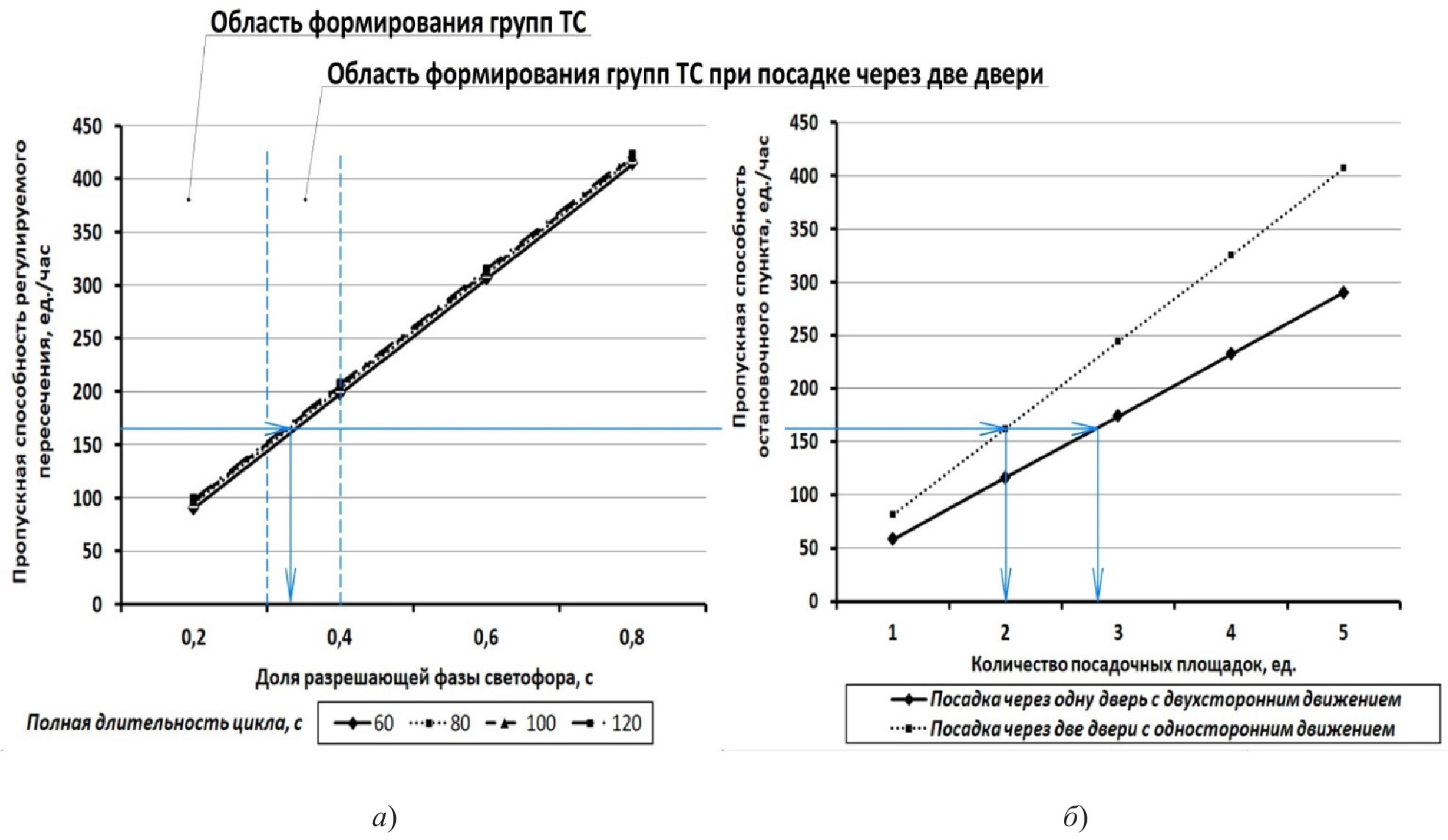 а – зависимости пропускной способности полосы на регулируемом пересечении от соотношения продолжительности фаз светофорного регулирования; б – зависимости пропускной способности остановочного пункта от количества посадочных площадок.