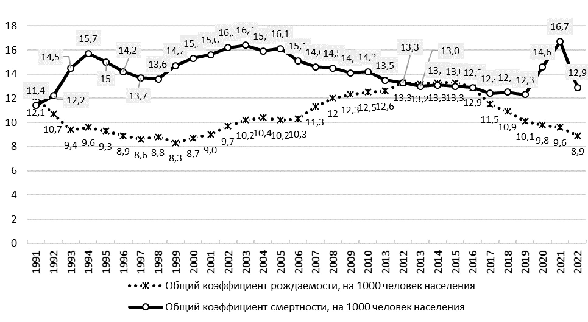 Рисунок 1. Коэффициенты рождаемости и смертности населения (на 1000 человек) за 1991–2022 годы