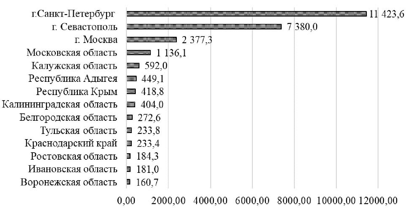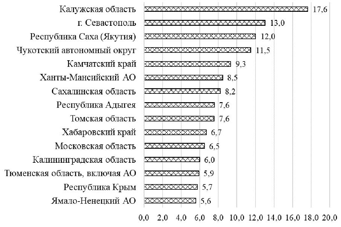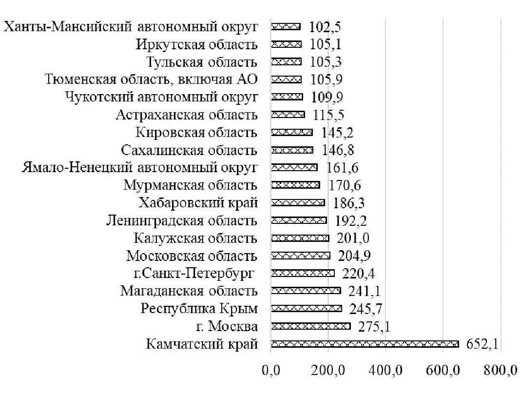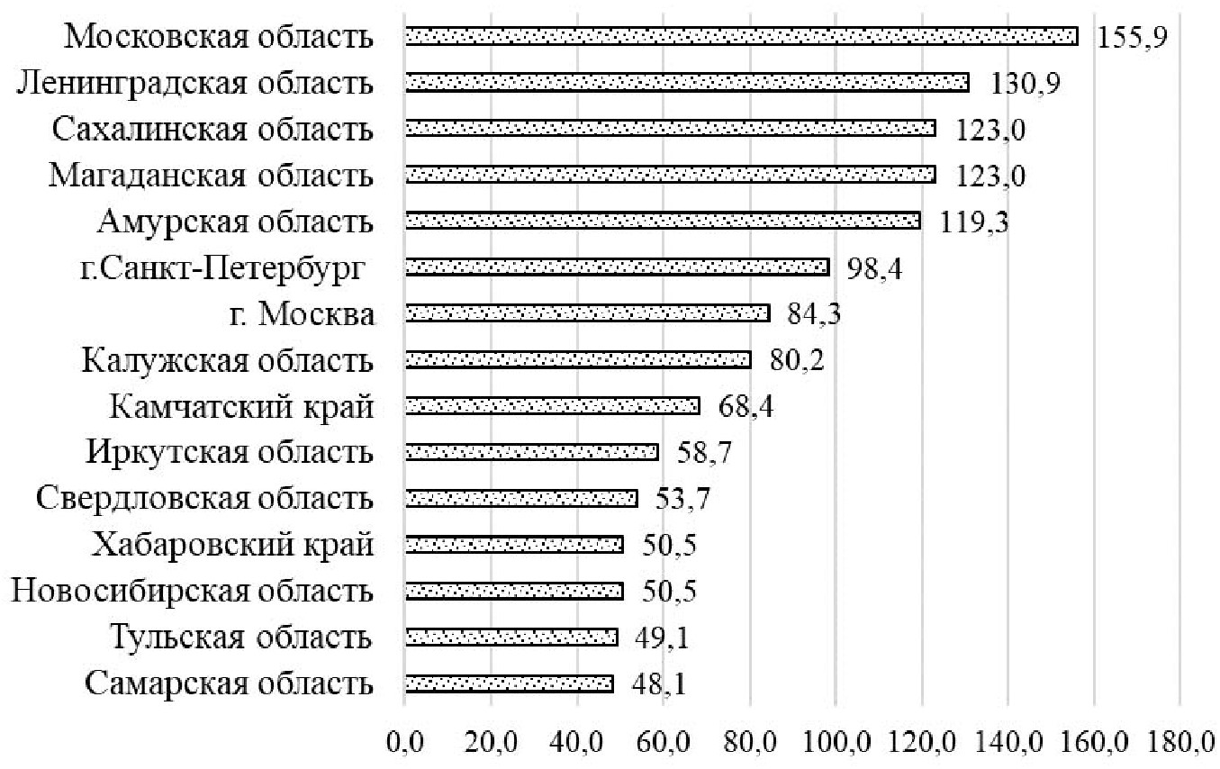 Как видно из представленных данных, высокие значения сложились не только для традиционно привлекательных с точки зрения международных мигрантов регионов (г. Москва, Московская область, г. Санкт-Петербург, Ленинградская область, Тульская область, Калужская), но и в субъектах с низкой численностью населения, которые в силу именно этого свойства оказались весьма чувствительны к миграционным потокам (Камчатский край, Сахалинская и Магаданская области).