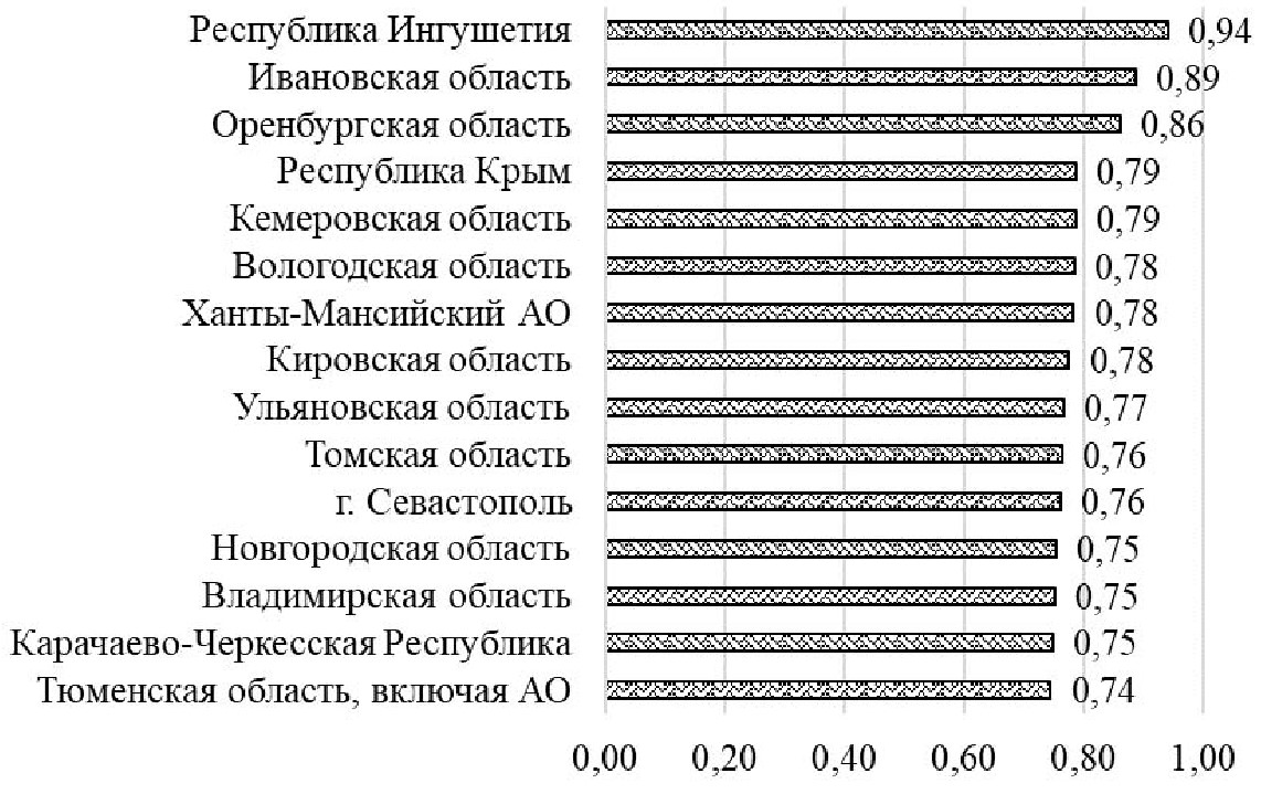 Высокие значения данного показателя (более 100) свидетельствуют, что существует риск трансформации способа интеграции различных культур от модели «плавильного котла», при которой многонациональные культуры «сплавляются вместе», в конечном итоге полностью ассимилируются в преобладающем обществе, в модель «салатницы», предполагающей гетерогенное общество, в котором люди сосуществуют, но сохраняют уникальные характеристики своей традиционной культуры. В этой ситуации культурные различия, поощряемые моделью салатницы, могут разделить общество и вызвать социальные и культурные конфликты [13]. На рисунке 2 приведены регионы РФ, в которых значение показателя превысило 100.