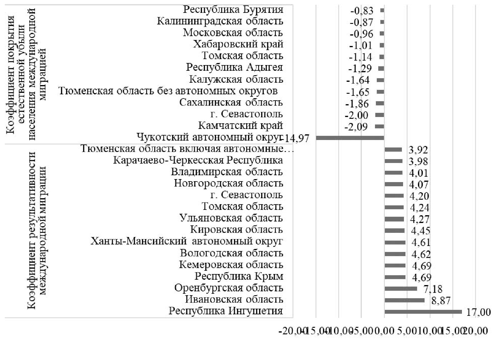 Мигранты здесь не оказывают сильного давления на работоспособное население, так как дефицита рабочей силы по большей части не наблюдается и рынки способны удовлетворить свои потребности самостоятельно. Таким образом, коэффициент результативности международной миграции в регионах также является относительно низким.
