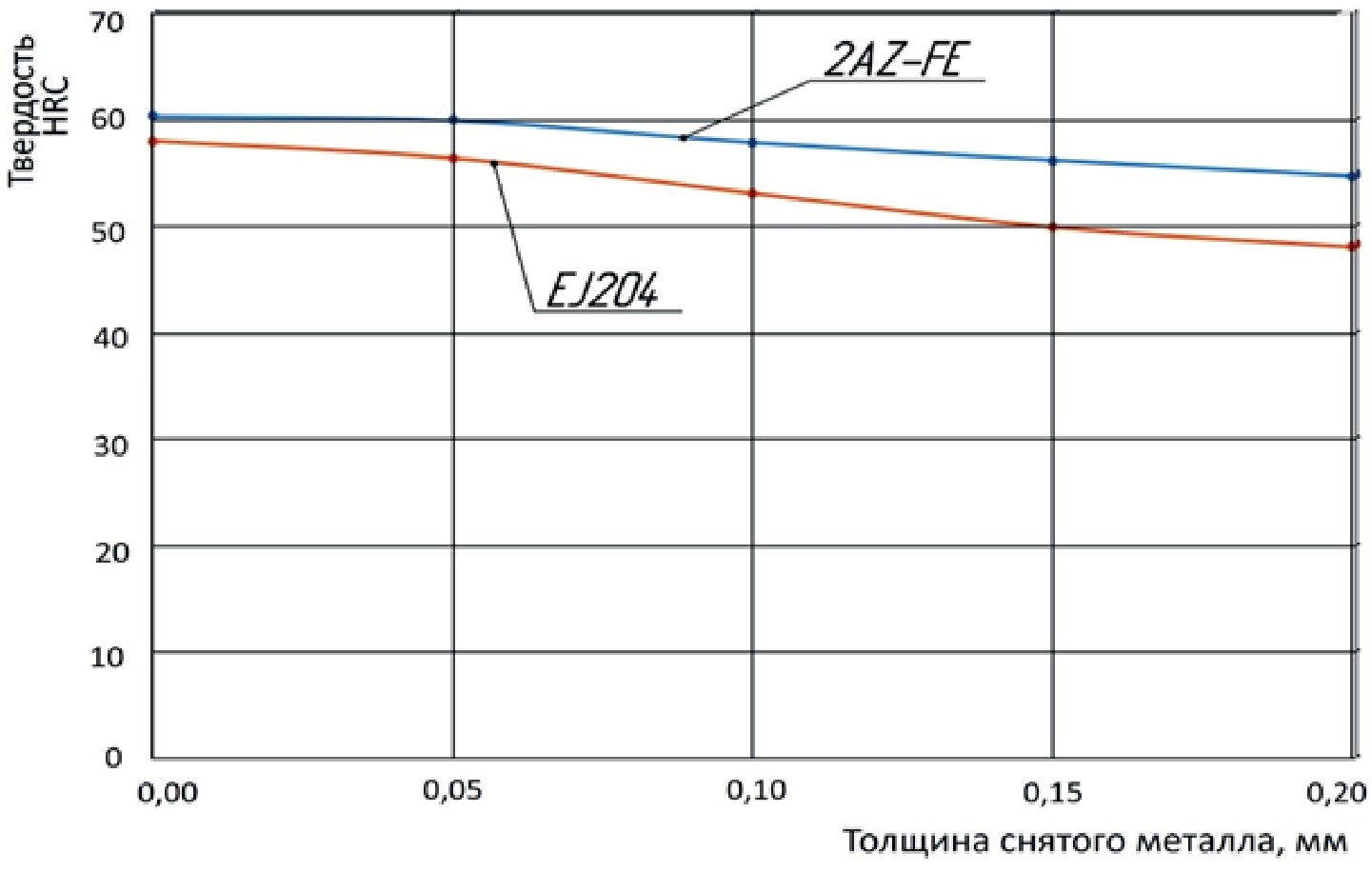 Рисунок 1. Изменение твердости наружных поверхностей пяты толкателей в зависимости от толщины снятого металла