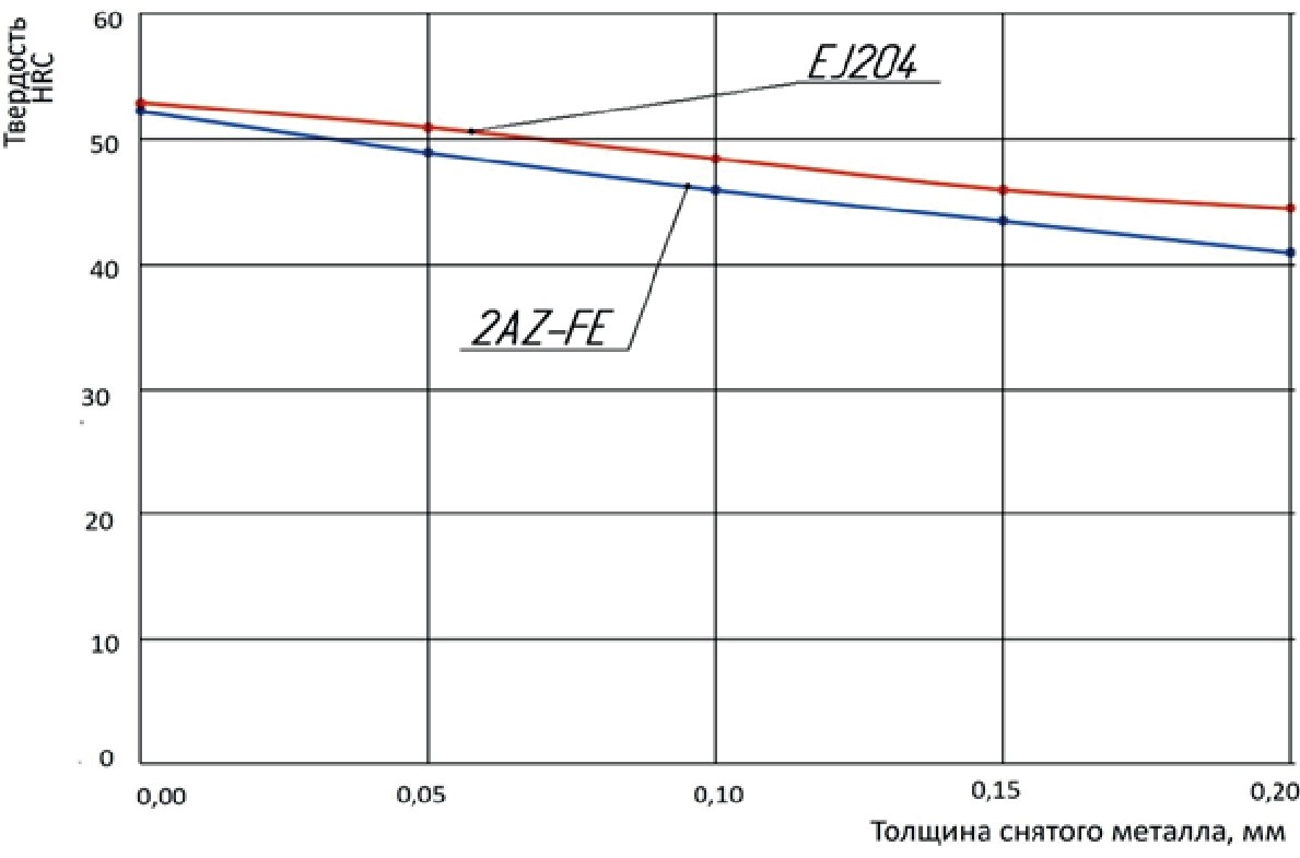 Рисунок 2. Изменение твердости внутренних поверхностей пяты толкателей в зависимости от толщины снятого металла
