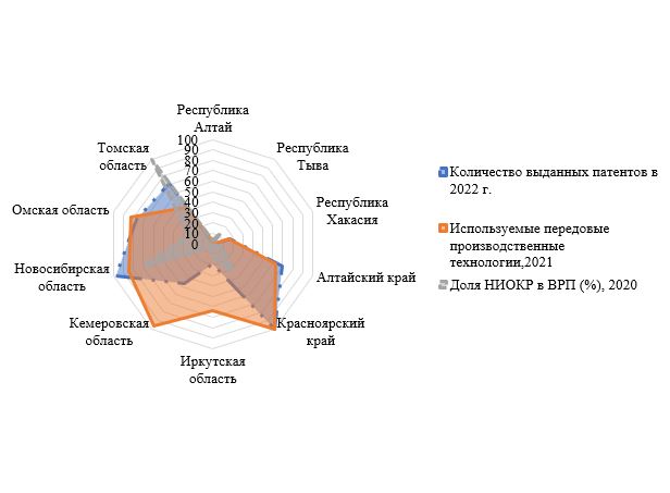 Наиболее высокое значение используемых передовых технологий отмечено в Красноярском крае (4145), Кемеровской области (3992), самое низкое – в Республике Алтай (251), Республике Тыва (143). Как отмечают исследователи, введение санкций против России стимулировало рост отечественных передовых технологий, в том числе среди добывающих, энергетических компаний в Сибири5.