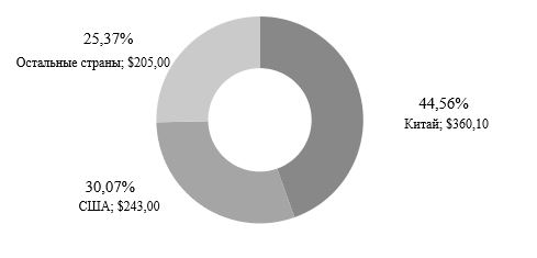 Соответственно, и киберспортивные рынки, с точки зрения доходов, на сегодняшний день имеют в лидерах такие страны, как Китай и США4. При этом только на Китай приходится 44% данного рынка, на США – почти треть, а четверть доходов мирового киберспортивного рынка делят между собой остальные страны (рисунок 3).