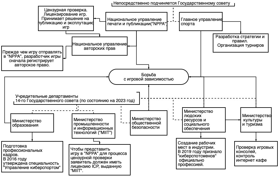 До марта 2018 года Национальное управление печати и публикации и Министерство культуры и туризма были двумя основными регуляторами индустрии компьютерных игр в Китае. Они занимались проверкой и утверждением цензуры игр, лицензиями на публикацию и эксплуатацию игр, а также обеспечением соблюдения различных отраслевых правил. Коммунистическая партия Китая 21 марта 2018 года обнародовала План углубления реформы партийных и государственных учреждений, который объединил основной орган регулирования игровой индустрии и перевел Национальное управление печати и публикации из структуры правительства в Государственный совет. После реорганизации Министерство культуры и туризма уже не занимается игровым контентом, проверкой цензуры и выдачей необходимых лицензий, однако оно по-прежнему занимается обеспечением соблюдения различных правил в индустрии компьютерных игр. На рисунке 4 систематизирована информация по Государственным органам комплексного регулирования игровой индустрии Китая и их функционалу. Интересным является тот факт, что все органы, несмотря на активные действия в отношении развития киберспортивной индустрии, основной своей задачей ставят борьбу с игровой зависимостью.
