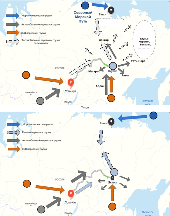 Проведённый анализ транспортной доступности различных районов Якутии показал, что они не имеют круглогодичного транспортного обслуживания. Это значительно затрудняет выполнение планов северного завоза. Более того, по естественным природно-климатическим характеристикам многие населённые пункты могут снабжаться продовольствием, топливом только в летний и зимний периоды эксплуатации по временным транспортным путям с перерывами, связанными с бездорожьем на суше и ледниковыми явлениями на реках. В связи с этим, планирование процессов доставки грузов северного завоза на основе использования математических моделей прогнозирования сроков действия временных транспортных путей, является актуальным.