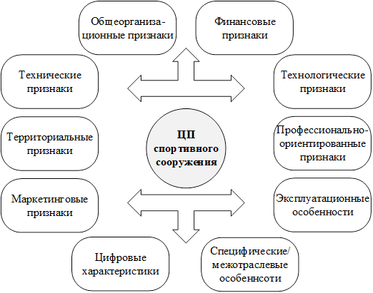 К группе общеорганизационных критериев можно отнести такие, как вид собственности, ведомственная принадлежность, организационно-правовая форма, включенность объекта в структуру спортивного кластера, уровень значимости: муниципальный, региональный, национальный, международный. Причём последний может быть соотнесён с уровнем проводимых соревнований. Так же в цифровом паспорте следует отразить специализацию согласно Всероссийскому реестру видов спорта, отношение к базовым видам спорта в регионе.