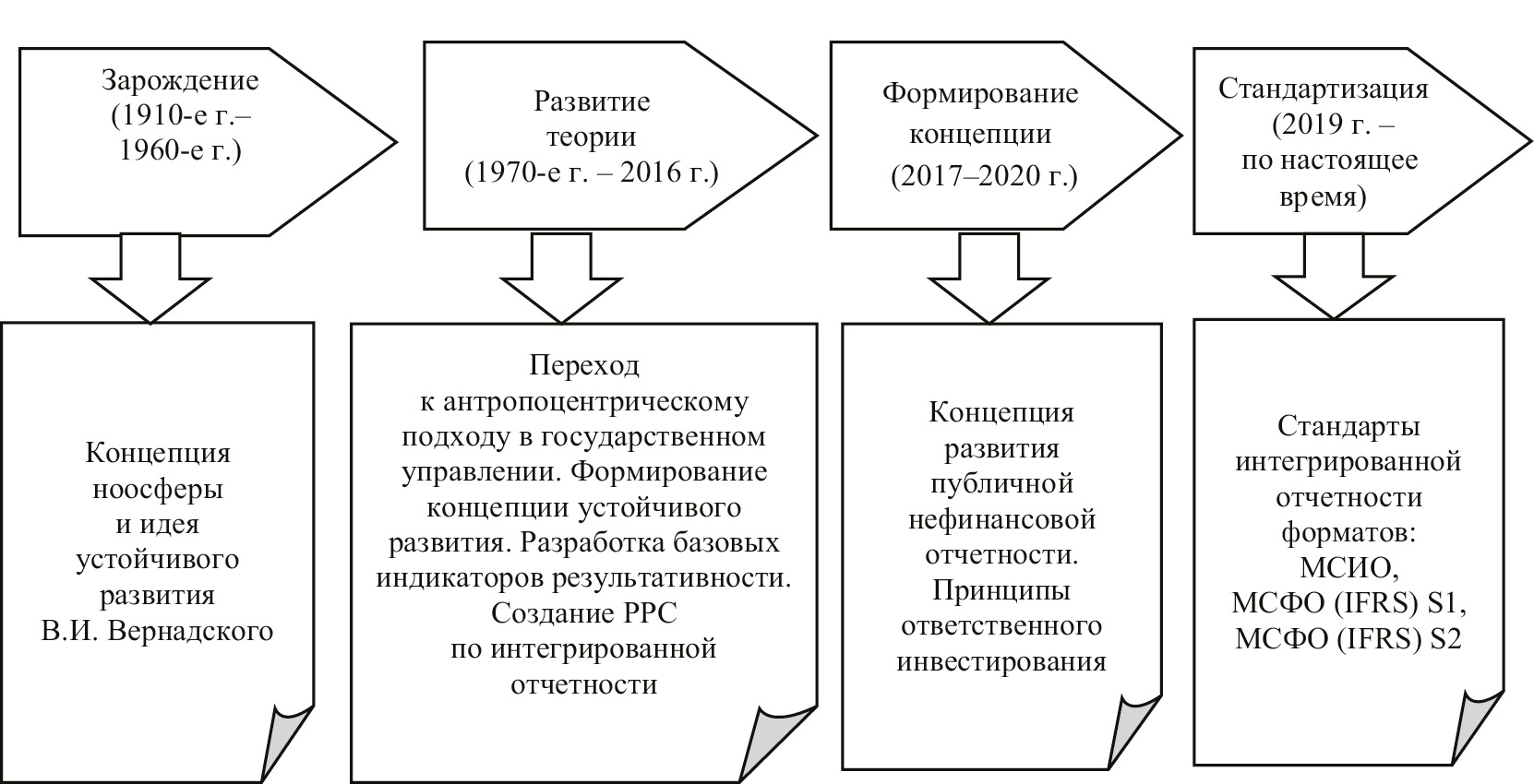 Исследование современных форм и тенденций интегрированной отчетности в РФ, на наш взгляд, невозможно без анализа исторических трансформаций понятия, целей, функций, организационных требований к данной форме отчетности. Систематизация современных работ отечественных и зарубежных специалистов, посвященных проблемам интегрированной отчетности, показала, что все исследователи акцентируют свое внимание на этапах развития данного вида нефинансовой отчетности, во-первых, в мировом масштабе, во-вторых, указывают границы периодов, но не формулируют их экономической сущности и названий. В частности, Сапожникова Н. Г., Ал-Халфи Х. К. К. выделяют шесть этапов развития интегрированной отчетности в мире, а П. А. Урду (P. A. Ordu) и С. О. Амах (C. O. Amah) – двенадцать [9; 23].