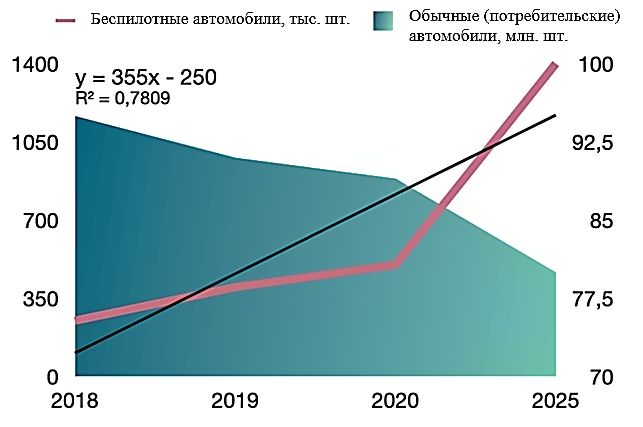 На рисунке 1 отражена динамика продаж беспилотных автомобилей 3-го уровня автономности (левая ось) по сравнению с продажами обычных автомобилей (правая ось) в период 2018–2025 гг. По Gartner, в 2019 году совокупный объем рынка потребительских и коммерческих автомобилей, находящихся на 3-ем уровне автономности, составил 398 тыс. единиц15.