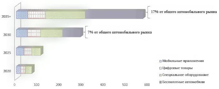 Специальные мобильные приложения, встроенные для коммуникаций между автомобилями и иными внешними объектами, к 2030 году достигнут годового объема в $86 млрд, а рынок оборудования (системы внутреннего контроля, связи и направления) – $103 млрд, при этом отдельно рынок беспилотных автомобилей составит $95 млрд22. Мобильные приложения, специальное оборудование и беспилотный транспорт к 2030 году принесет $292 млрд годовой выручки23. Так, рынок беспилотных автомобилей составит 7% от общего автомобильного рынка и возрастет к 2030 году в 5–7 раз вместе с сопутствующими ему приложениями и товарами. Это создаст более кооперационную среду на рынке между технологическими и автомобильными компаниями.
