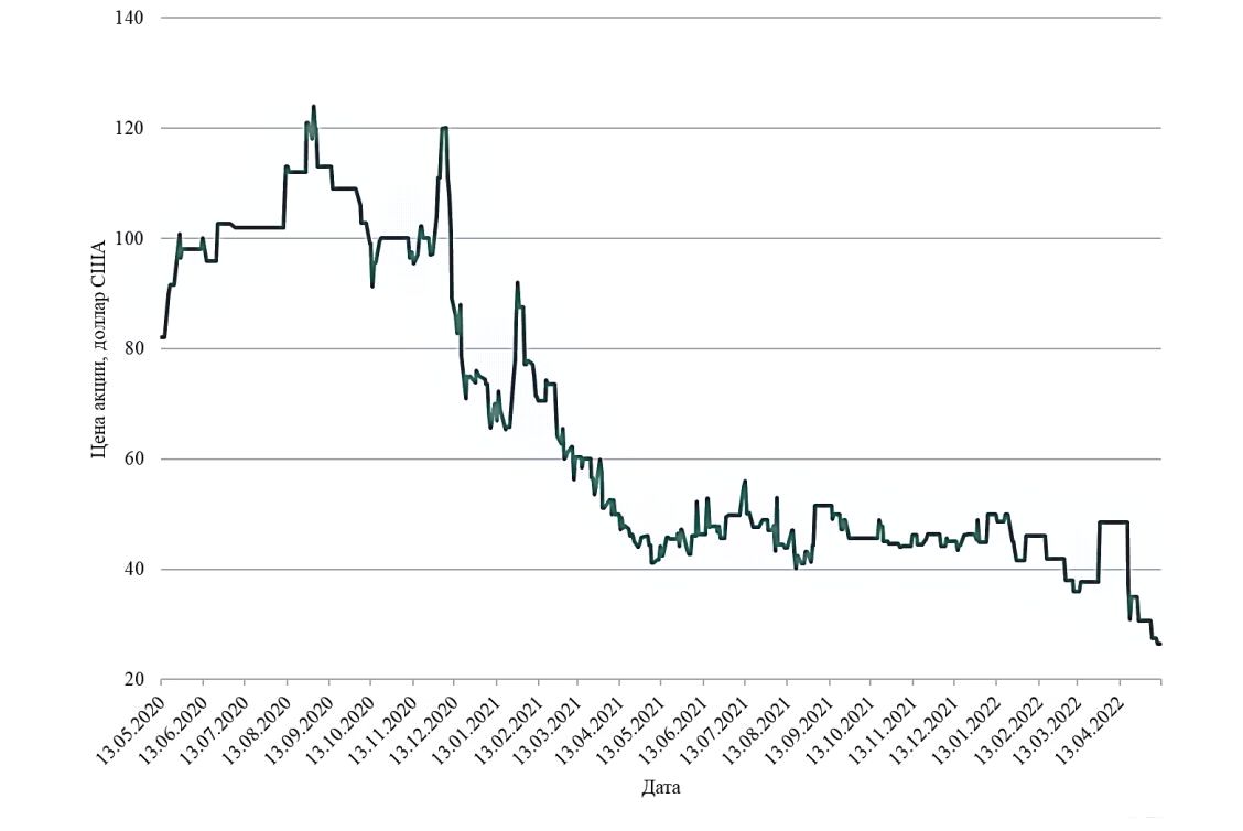 На рисунке 3 представлены данные о стоимости акций компании за период с 13 мая 2020 года по 12 мая 2022 года. Цена имеет нисходящий тренд с достаточно резкими падениями, в связи с чем можно предположить, что показатель VaR мог бы оказаться значительным, если бы расчёты производились методом исторической симуляции.