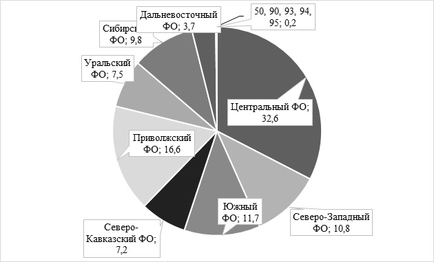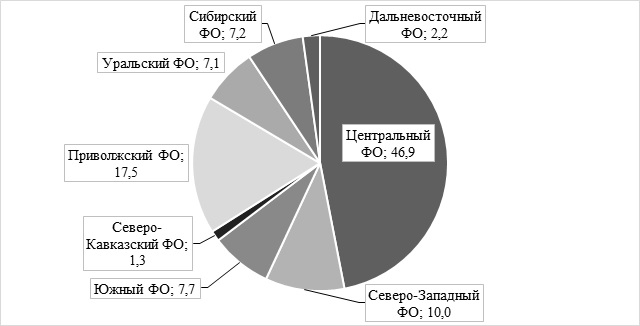 Из диаграммы рисунка 4 видно, что Центральный федеральный округ имел удельный вес более 46%, а наименьшая доля приходилась на Северо-Кавказский федеральный округ, все субъекты которого подключились к режиму только с 1 июля 2020 года.