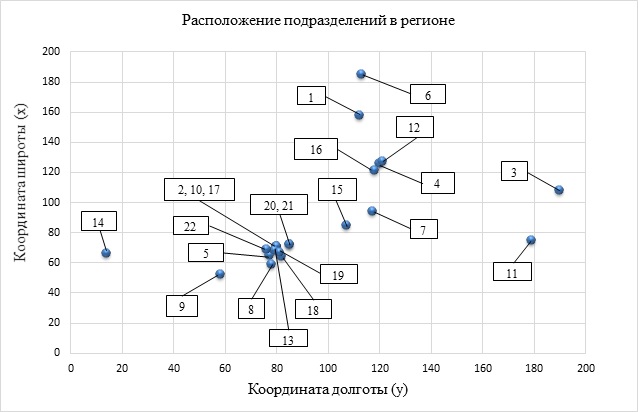 Полученные и обработанные данные по подразделениям позволили построить сетку координат на карте региона по координатам широты X и долготы Y их расположения. Матрица расстояний между рассматриваемыми региональными подразделениями приведена в таблице 1.