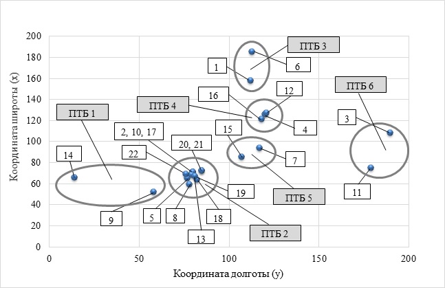 Далее определялись центры тяжести транспортных потоков с учётом затрат на эксплуатацию специализированного автопарка. По итогам этих расчётов были определены места дислокации шести головных ПТБ (см. рисунок 3).