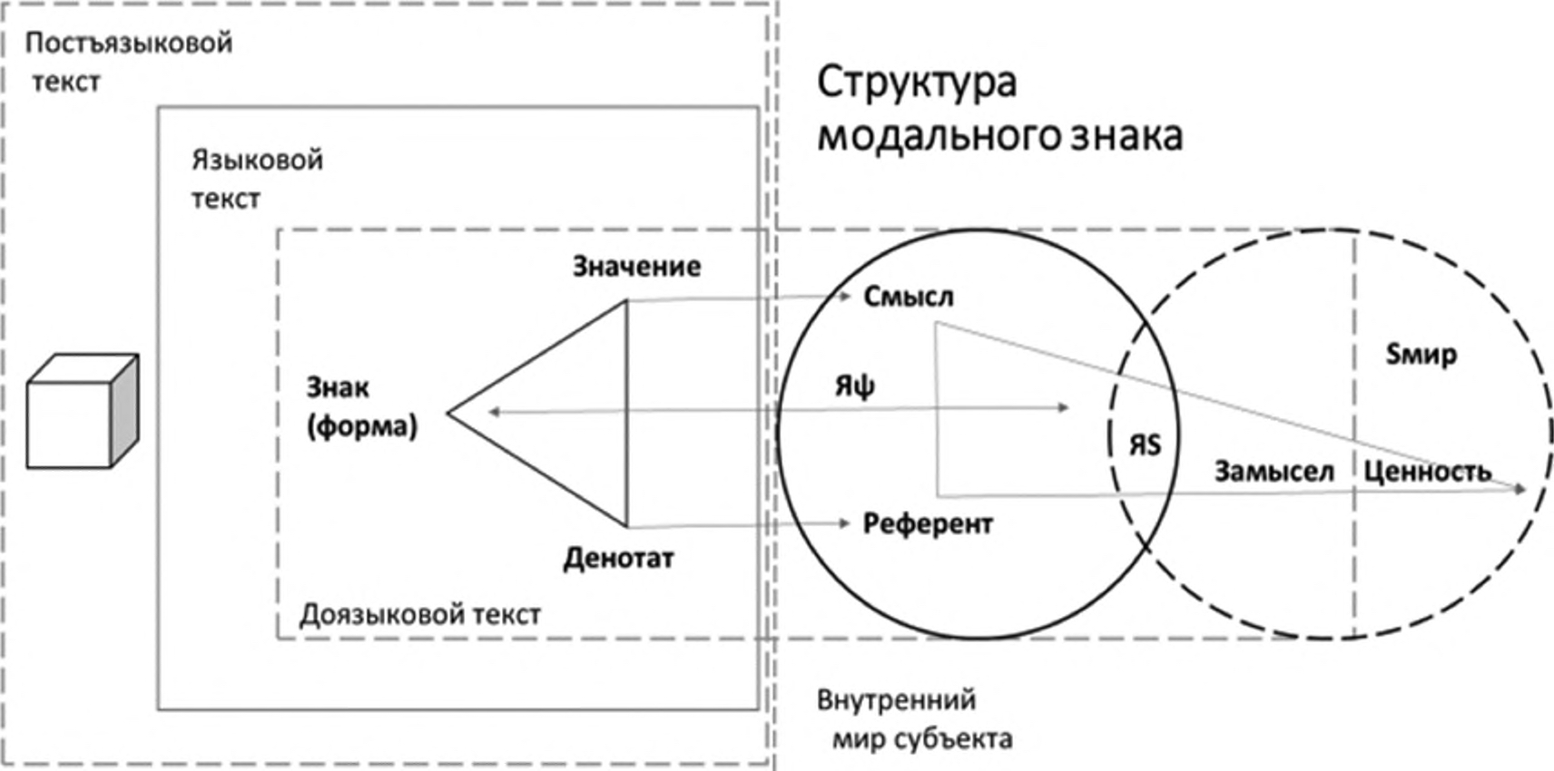 Содержание субъектного мира определяет замысел, способ и результаты конструирования реальности в процессе воссоздания телесно-когнитивной целостности существования своей формы живого. В логико-лингвистическом представлении преобразуем модель субъекта в модальный знак многоуровнего текста (рис. 1).