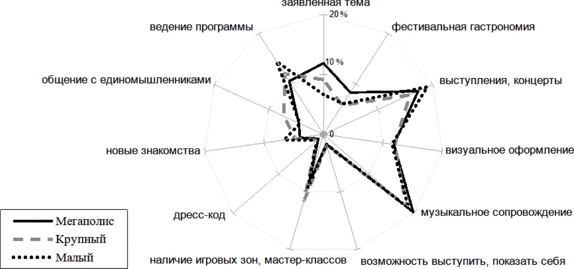 При этом доминирующая триада «выступление – оформление – ярмарки» более выражена для городских и коммерческих мероприятий. Значимость выступлений и оформления менее выражена у тех интересантов, кто чаще посещает клубно-студийные мероприятия (хотя у них более выражены ожидания деятельностного опыта, конкурсной программы и социальной активности).