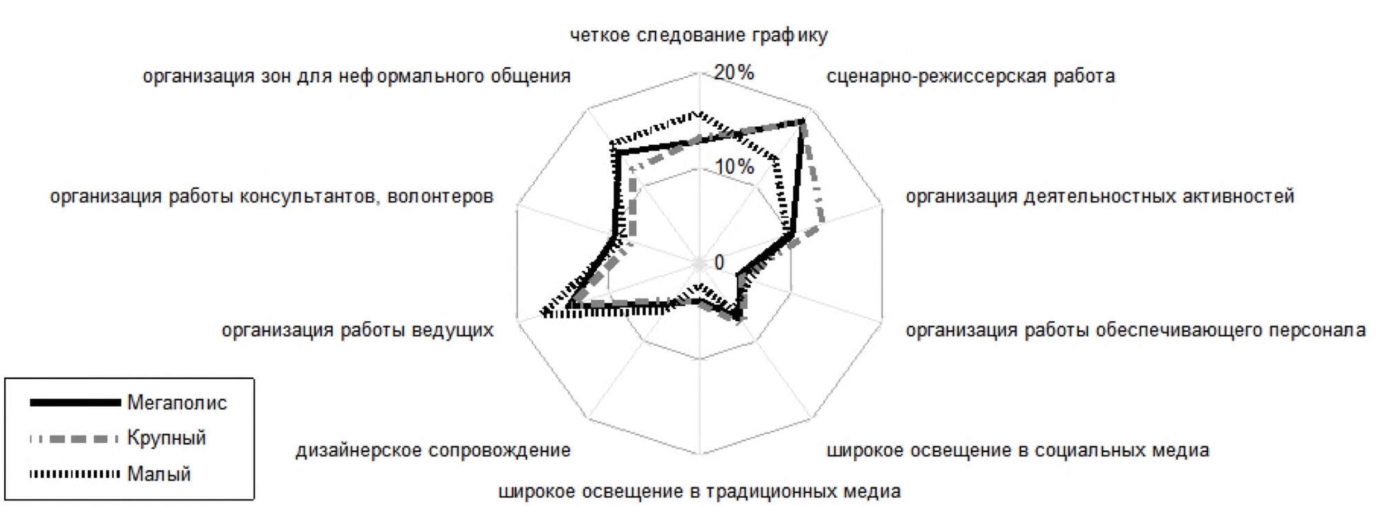 Первый аспект относится к проблеме выработки теоретико-методологических оснований структуры исследования (и вопросов к респондентам), которые бы соответствовали особенностям управления организацией мероприятия в современных условиях. Многие исследования последних лет не имеют четко определенной структуры, авторы руководствуются частными задачами (например, установления факта удобства места или времени, привлекательности того или иного формата, оценки качества мероприятия и т.д.) [Мартышенко Н.С., 2020; Толстяков Р.Р. и др., 2021; Землянная А.С., Савостин Д.А., 2020]. Среди примечательных комплексных исследований можно, например, отметить работу В.П. Устинова и соавт. [Устинов В.П. и др., 2014], которая посвящена психологическим аспектам проведения и посещения мероприятий; Е.П. Поповой [Попова Е.П., 2022], в которой проводится сегментирование потребителей событийного туризма. Отметим также некоторые исследования зарубежных авторов: M.-A. Stricklin и G. Ellis, структурировавших элементы мероприятия на художественные и технические [Stricklin M.-A., Ellis G.D., 2018]; A. Dalgiç и K. Birdir, исходящих из принципов теории систем [Dalgiç A., Birdir K., 2020]; Y. Ait Kerroum и K. Anasse, основывающихся на принципах «полисистемности» и определения различных «сил, которые формируют производство и восприятие культурных событий в городской среде» (перевод наш. — В.Ш.) [Ait Kerroum Y., Anasse K., 2024]. Таким образом, мы по-прежнему испытываем недостаток в комплексных социологических исследованиях особенностей восприятия посетителями массовых социокультурных мероприятий.