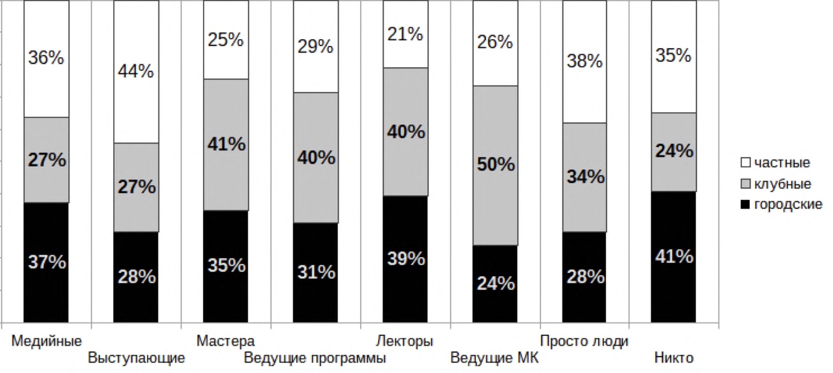 Завершая представление результатов, уделим внимание выбору той или иной потенциальной референтной персоны (представителя референтной группы) из числа присутствующих или приглашенных на мероприятие. Представим их в порядке убывания частоты упоминаний: танцоры, спортсмены и другие выступающие сценической программы (21 %), мастера своего дела, специалисты-практики, мастера-ремесленники и пр. (16 %), просто некоторые посетители (11 %), медийные персоны и блогеры (10 %), ведущие программы и мастер-классов, лекторы-спикеры (менее 10 % каждый). При этом завсегдатаи мероприятий различных типов склонны несколько по-разному оценивать этот элемент социальной среды мероприятия (рис. 4). Лишь 20 % отметили, что для них таковой личностью не может являться никто из предложенных примеров.