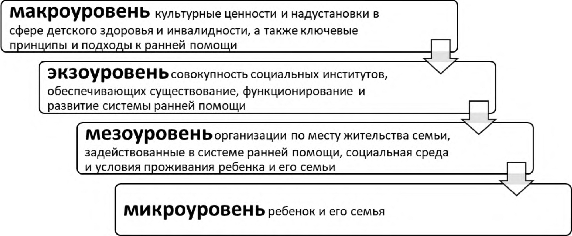 Уровни ранней помощи | микроуровень мезоуровень экзоуровень макроуровень |