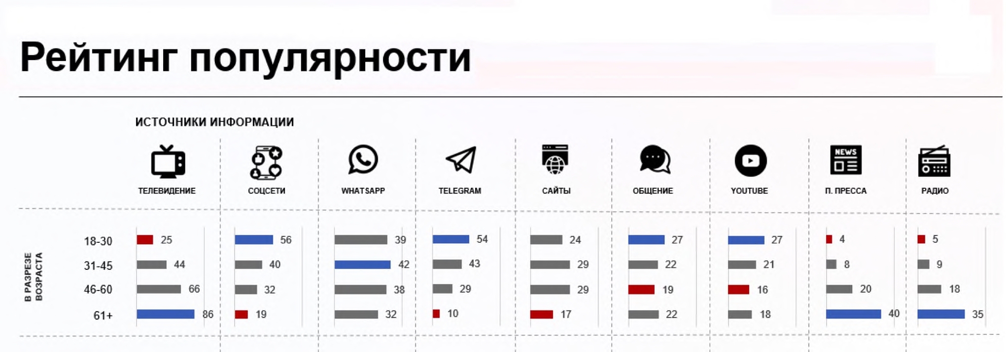 Молодежь получает информацию в основном из Тelegram и Whatsapp. Так, в возрасте 18–30 лет наибольшая частота пользования («практически ежедневно») зафиксирована в Whatsapp (86 %), Тelegram (46 %). ВКонтакте — 18 %, Инстаграмм — 23 %. Учитывая относительно высокое доверие к Тelegram и его популярность, необходимо уделять особое внимание к информированию молодежи в данном мессенджере. Если основной целью использования WhatsApp закономерно является общение (87 %), то пользователи Telegram в основном ищут в этом мессенджере информацию (43 %) — актуальные новости, развлекательный контент, аналитику. 30 % отметили, что используют Telegram для общения. Основной целью использования ВКонтакте респонденты называют просмотр видео, фото и прослушивание музыки (29 %), чтение развлекательного контента (20 %), общение с друзьями и знакомыми (18 %).