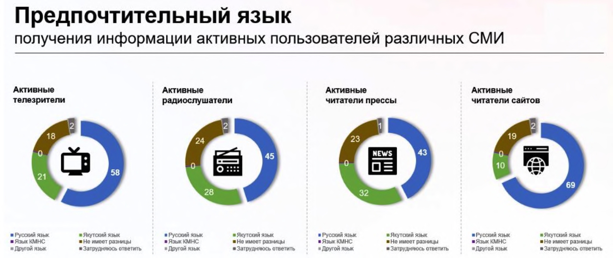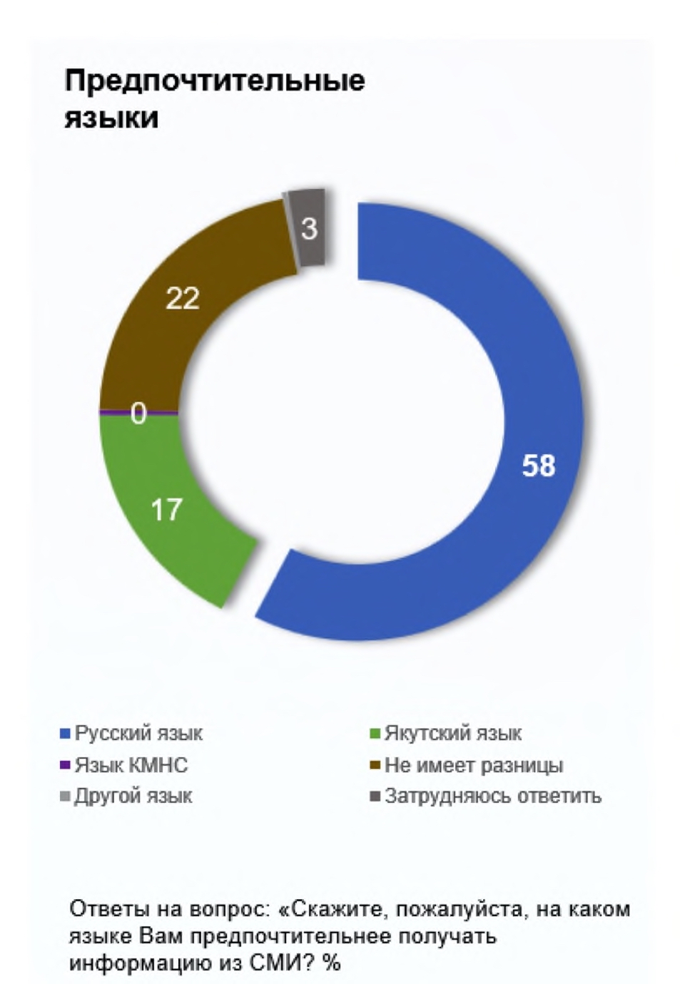 На вопрос «Скажите, пожалуйста, на каком языке Вам предпочтительнее получать информацию из СМИ?» бо́льшая часть респондентов из массива ответила, что предпочтительным языком получения информации из СМИ является русский язык (58 %). Якутский в качестве предпочтительного языка потребления указывают лишь 17 % опрошенных из общего массива. При этом 22 % ответили «Не имеет разницы» (рис. 3).