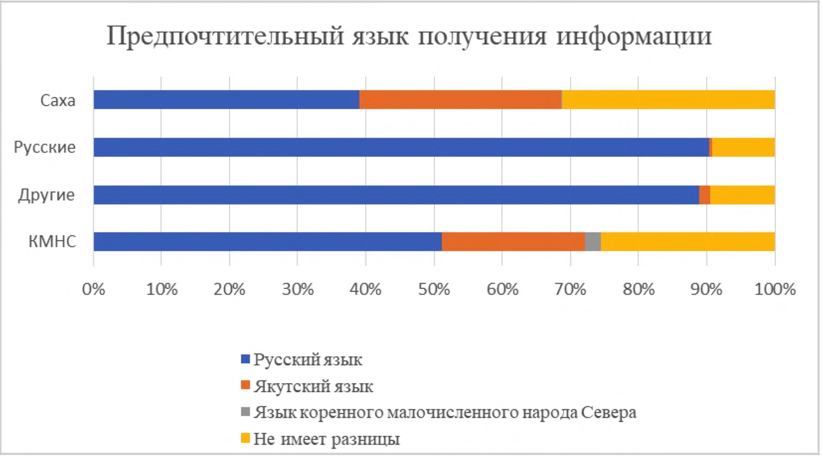 В разрезе национальности саха более неудовлетворены объемами информации на предпочтительном языке. Так, 60 % опрошенных саха ответили, что «абсолютно не удовлетворены объемом получаемой информации на предпочтительном для меня языке», 67 % хотелось, чтобы информации на этом языке было больше (таблица).