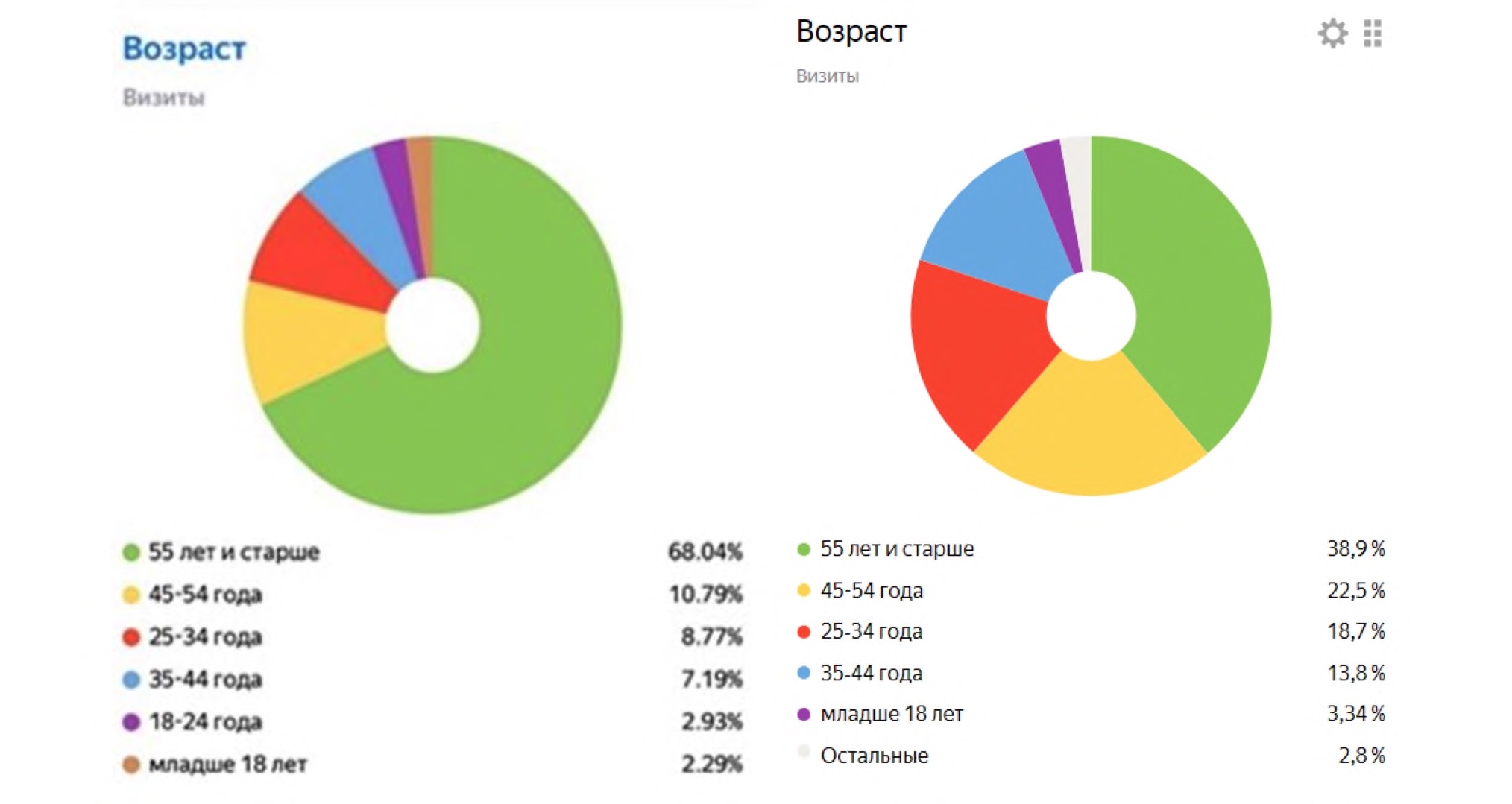 Рис. 7. Аудитория сайтов Edersaas.ru (слева) на ноябрь 2021 г. и Sakha-sire (справа) на сентябрь 2023 г. по данным Яндекс.Метрика