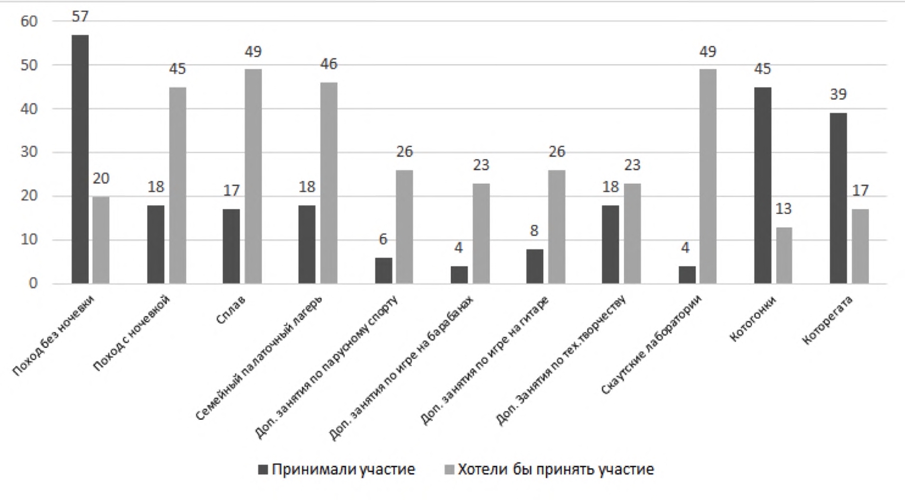 Рис. 2. Распределение ответов на вопрос «В каких мероприятиях скаутского отряда вы участвовали/хотели бы принять участие вместе с ребенком?» (количество ответов)