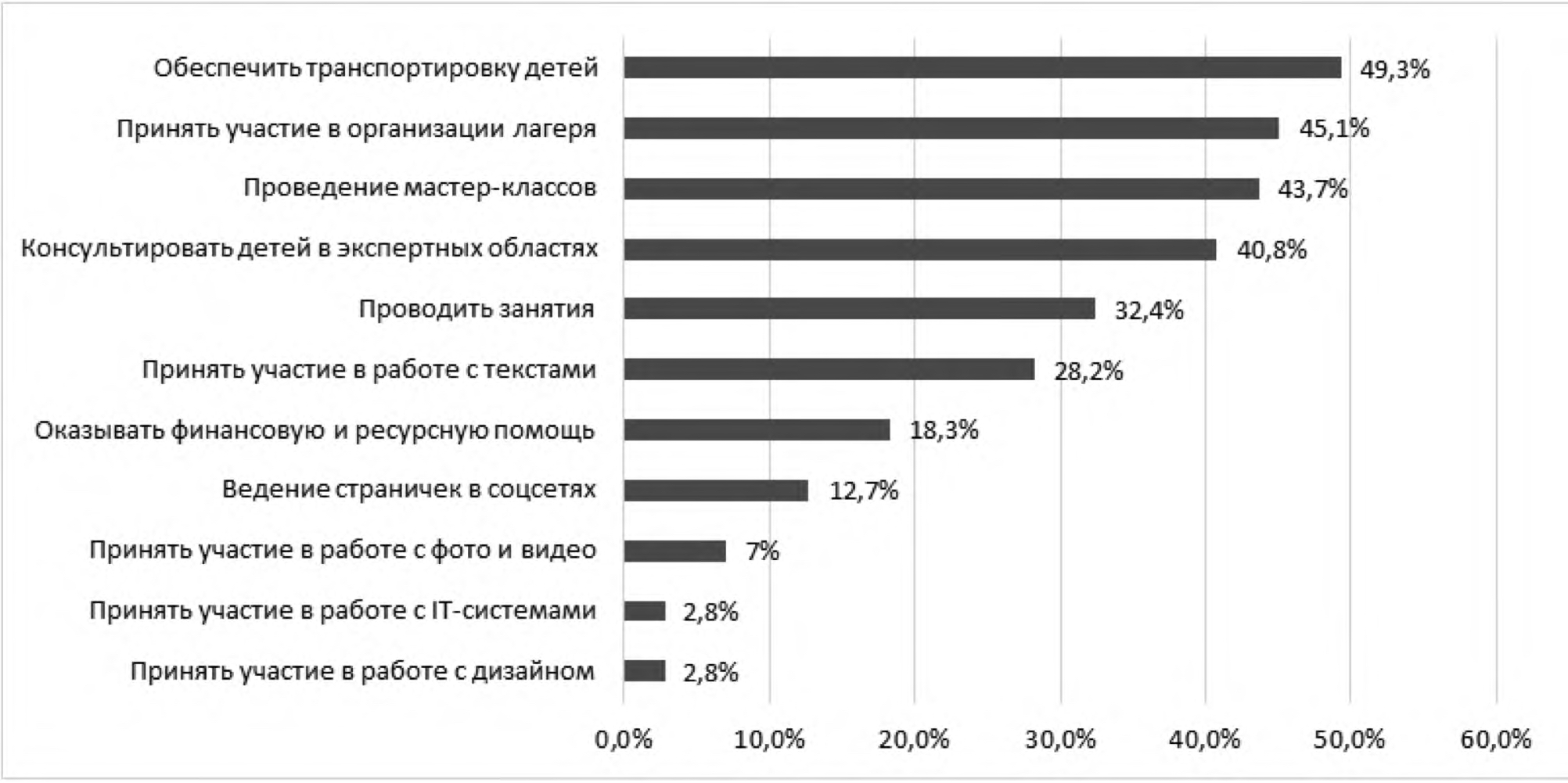 Среди предпочтительных форм оказания волонтерской деятельности нужно отметить помощь с доставкой детей (49,3 %), помощь в организации выездных лагерей (45,1 %) и проведение мастер-классов (43,7 %). Это именно те типы волонтерской помощи, которые не требуют специальной подготовки, выполняются совместно с другими родителями и не требуют много времени. В наименьшей степени родители готовы к помощи, требующей специальных навыков (фотои видеосъемки, программирования или дизайна) (рис. 3).