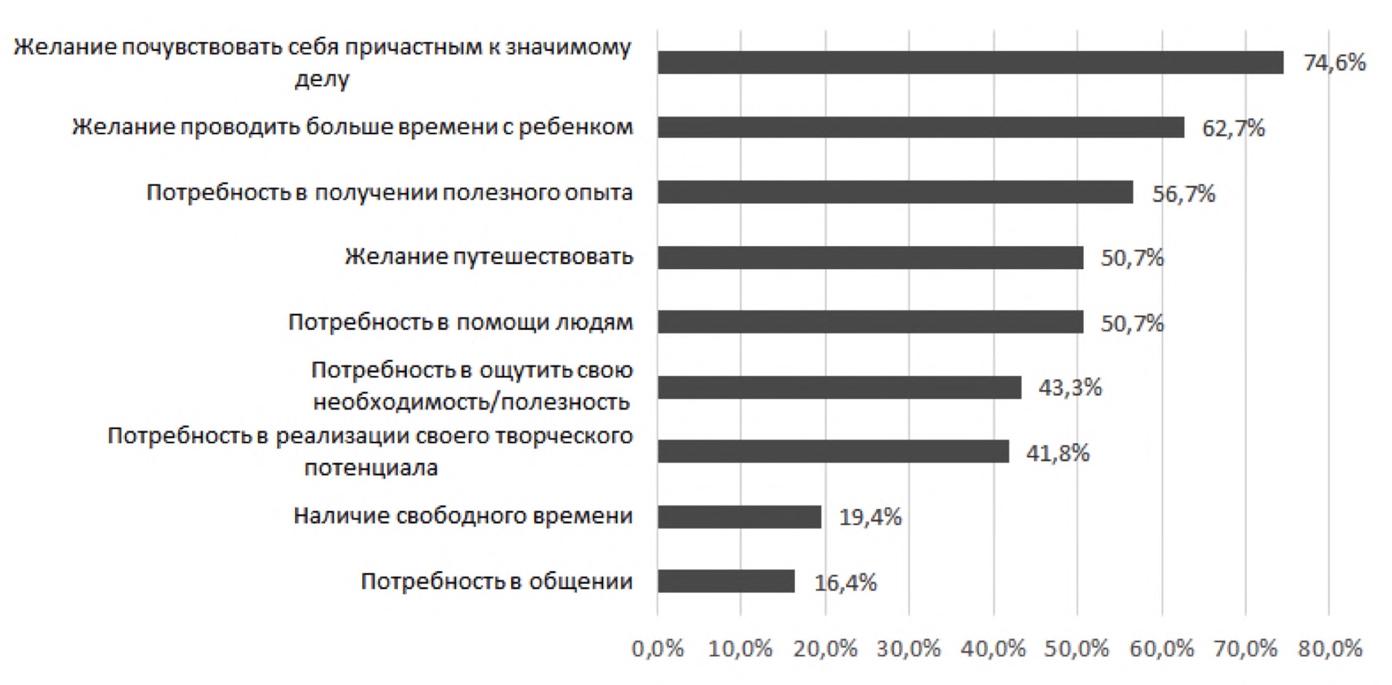 В мотивации родителей-волонтеров доминируют две формы установок: во-первых, осознание социальной значимости и причастности к работе отряда, а во-вторых, желание больше общаться со своими детьми. Комплекс ответов, которые выбирали респонденты, в целом соответствует типичной мотивации волонтеров, включающей получение полезного опыта, потребность оказывать помощь другим людям, стремление ощущать собственную полезность, желание путешествовать и реализовать свой творческий потенциал (рис. 4).