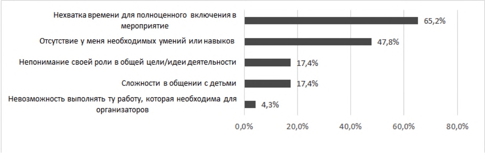 Сложности волонтерской деятельности, которые отмечают респонденты, связаны с их ресурсными ограничениями (рис. 5). Значительная часть респондентов (65,2%) ссылается на нехватку времени, что участники групповых интервью характеризуют как тактику ухода от волонтерской помощи. Другие сложности, которые называли респонденты, представляют собой констатацию ограничений навыков в организации мероприятий и неумение общаться с детьми. При этом родители не ссылались на финансовые ограничения.