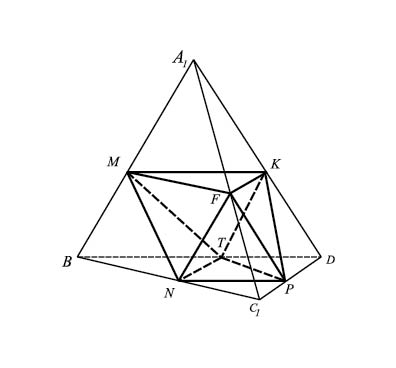 Рис. 3. Середины ребер правильного тетраэдра A1BC1D являются вершинами октаэдра MNFKTP.