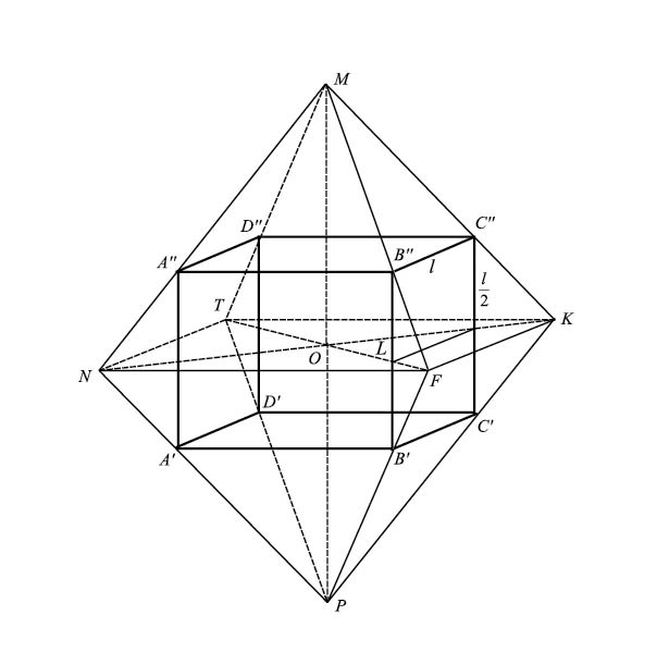 Рис. 4. Середины ребер октаэдра MNFKTP являются вершинами прямоугольного параллелепипеда A′B′C′D′A′′B′′C′′D′′.