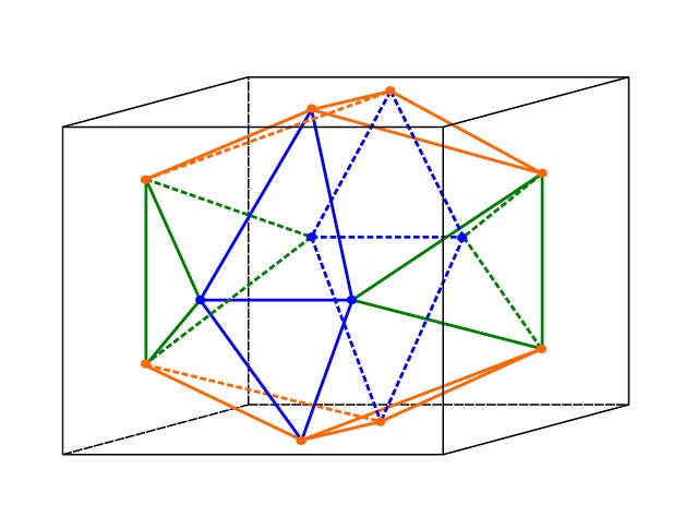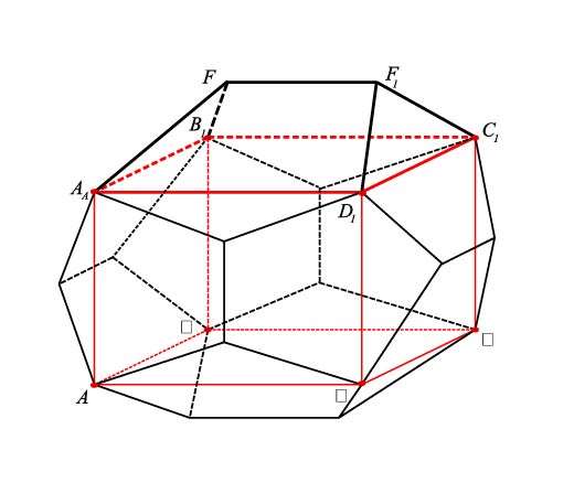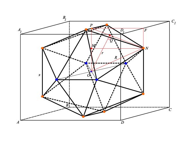 Рис. 6. Куб ABCDA1B1C1D1 вписан в додекаэдр так, что его вершины служат диагоналями граней додекаэдра. Все грани куба являются основаниями многогранников типа A1B1C1D1FF1, в котором ребра FF1,A1D1, B1C1 параллельны друг другу. Центр симметрии куба и додекаэдра, а также радиусы описанной и полувписанных сфер показаны на рис. 9.