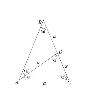 [Figure 8. Using the isosceles triangle with an angle of 36◦ at the vertex, we may calculate the following cos 36◦.]