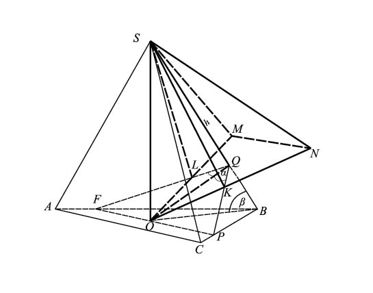 Рис. 16. Правильная треугольная пирамида SABC скомбинирована с правильной четырехугольной пирамидой SQKOL так, что высота каждой из них находится на боковом ребре другой.