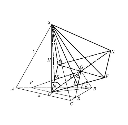 Рис. 15. Высота правильной пирамиды SOMNF находится на боковом ребре правильной пирамиды SABCD, а ее боковое ребро – на высоте SABCD.