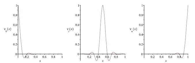 Fig. 4. The graphs of the functions ν0(x), νi(x), i = 1, 2, ...,n − 1 and νn(x) given by formula (22)(from the left to the right).