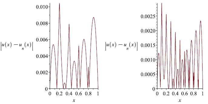 6. Fig. 5. The graphs of the error |u(x) − un(x)| for n = 5 (on the left) and n = 10 (on the right), respectively (for the boundary value problem (24)).