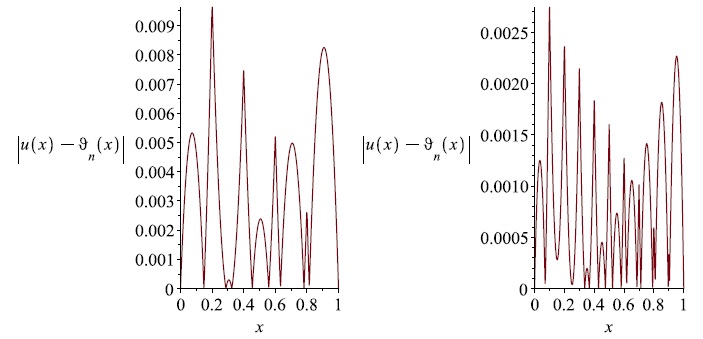 7. Fig. 6. The graphs of the error |u(x)−ϑn(x)| for n = 5 (on the left) and n = 10 (on the right), respectively (for the boundary value problem (24)).