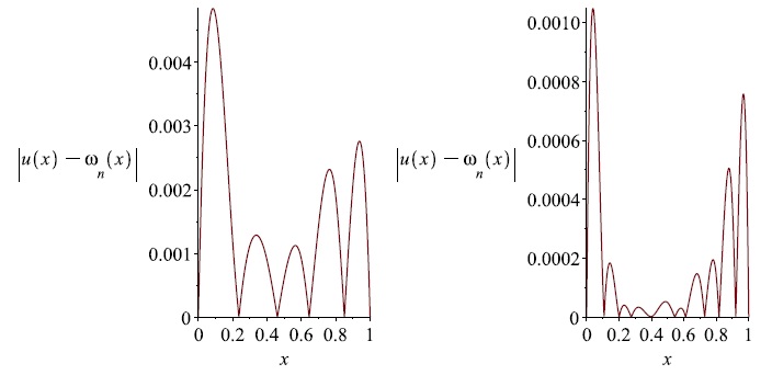 Fig. 7. The graphs of the error |u(x) − ωn(x)| for n = 5 (on the left) and n = 10 (on the right), respectively (for the boundary value problem (24)).