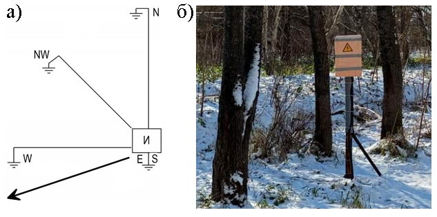 Рис. 2. Схема взаимной ориентации трех измерительных диполей на площадке ИМГиГ ДВО РАН (а) и внешний вид электроизмерительного модуля «ИМПульс» (б), (фото И.П. Дудченко). Обозначения диполей: N-S – направлен на север относительно общей точки, W-E – на запад, NWSE – на северо-запад. Стрелка – направление на эпицентр землетрясения 09.08.2023, находящийся на расстоянии 7,6 км от пункта измерений. Длина диполей N-S, W-E и NW-SE – 100 м.