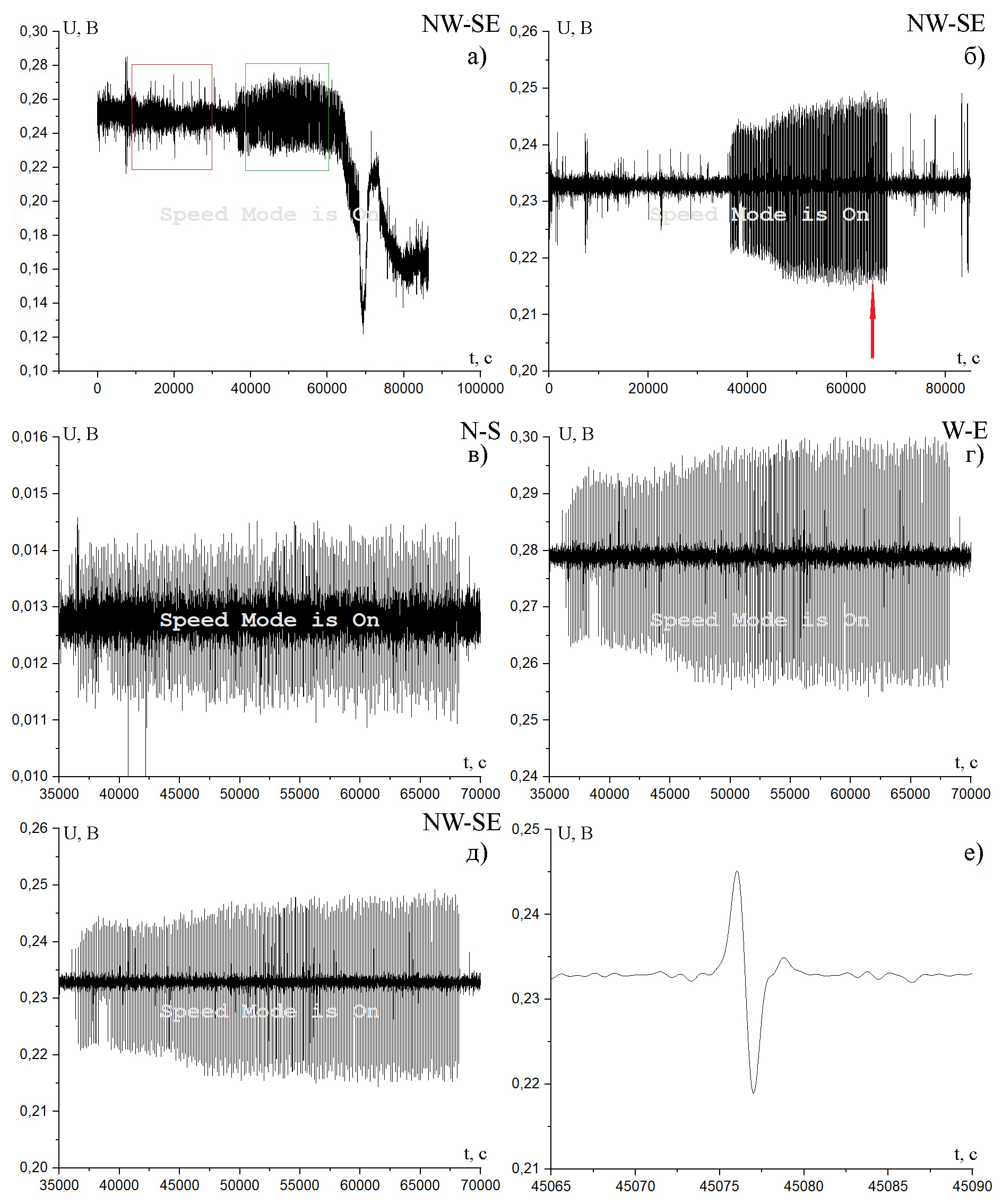 На рис. 5а показана запись сигнала на канале NW-SE с 11 часов 8 августа до 11 часов 9 августа (запись без применения фильтров). В этот период произошло рассматриваемое нами землетрясение. На записи видно, что есть усиление сигнала в ночной период времени, но также видно, что фильтрация необходима ещё на сверхнизких частотах для удаления трендов. После применения полосового фильтра 0,01-1 Гц (рис. 5б) стало видно, что перед землетрясением в ночное время суток наблюдается серия импульсов. Также было определено, что эта серия идёт по всем каналам, но с разной амплитудой (рис. 5в-д). При внимательном рассмотрении выяснилось, что это серии двуполярных сигналов длительностью 4-5 секунд с периодом следования 132-133 секунды (рис. 5е). Серия наблюдалась приблизительно с 21 часа 8 августа до 5 часов 55 минут 9 августа. Интересно наличие зависимости амплитуды сигналов от ориентации диполей. Наибольшая амплитуда у сигналов на диполе W-E, который почти параллелен азимуту на землетрясение 9 августа. Наименьшая же амплитуда на диполе N-S, который тому же азимуту почти перпендикулярен (рис. 2, рис. 5).
