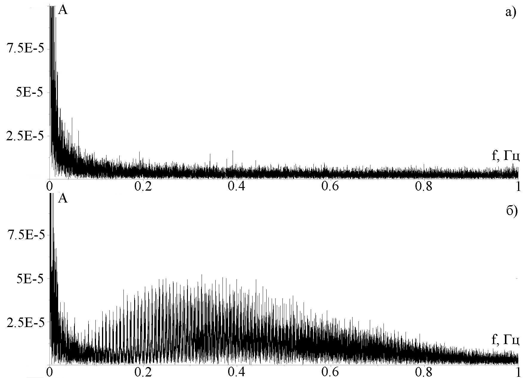 При рассмотрении спектрального состава записи в низкочастотной области заметных максимумов на периодах 130-135 секунд обнаружено не было, что означает отсутствие четкого периода следования обнаруженного сигнала. Более того, в период регистрации серии импульсов (рис. 6б) наблюдается серия максимумов на частотах от 0,1 до 0,5 Гц и это, вероятно, означает, что при обработке сигналы воспринимаются одиночными и размываются в спектре (рис. 6б).