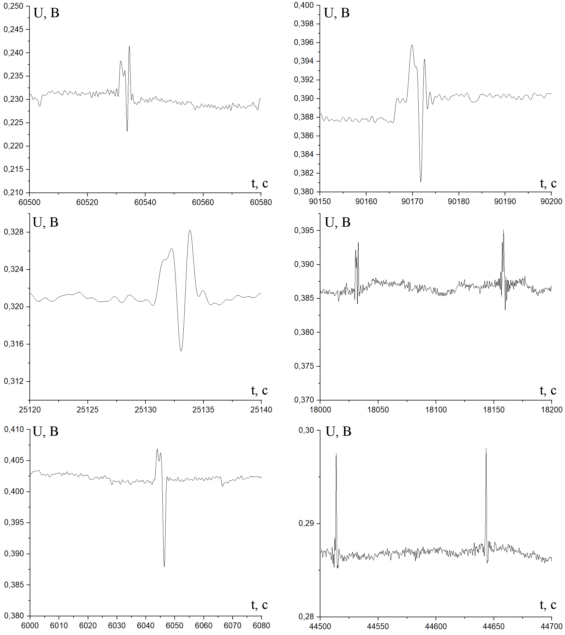 Дальнейшая обработка записей ЭТП в течение всего периода регистрации проводилась, чтобы исключить случайное совпадение серии сигналов неизвестной формы со временем землетрясения. Для этого важно было получить данные в периоды, когда землетрясений рядом с пунктом регистрации нет или когда там произошли другие землетрясения. В данной работе анализировались суточные записи с 20 июля 2023 года по 10 февраля 2024 года (также были обработаны несколько суток июня, когда аппаратура не работала в постоянном режиме). Для определенности мы взяли территорию вокруг полигона с радиусом 0,25 градуса (примерно 20-30 км по широте и долготе, координаты полигона 46,95° с.ш., 142,72° в.д.). Такой выбор мы сделали по аналогии с работами греческих коллег, чья методика измерений нам наиболее близка, и которые наблюдали SES (серии электромагнитных сигналов Земли) в 20-километровой области [?]. Землетрясения с M > 3 представлены в табл. 1, и фактически их всего два. Сейсмические данные были получены из еженедельных каталогов землетрясений Сахалина и Курильских островов СФ ФИЦ ЕГС РАН.
