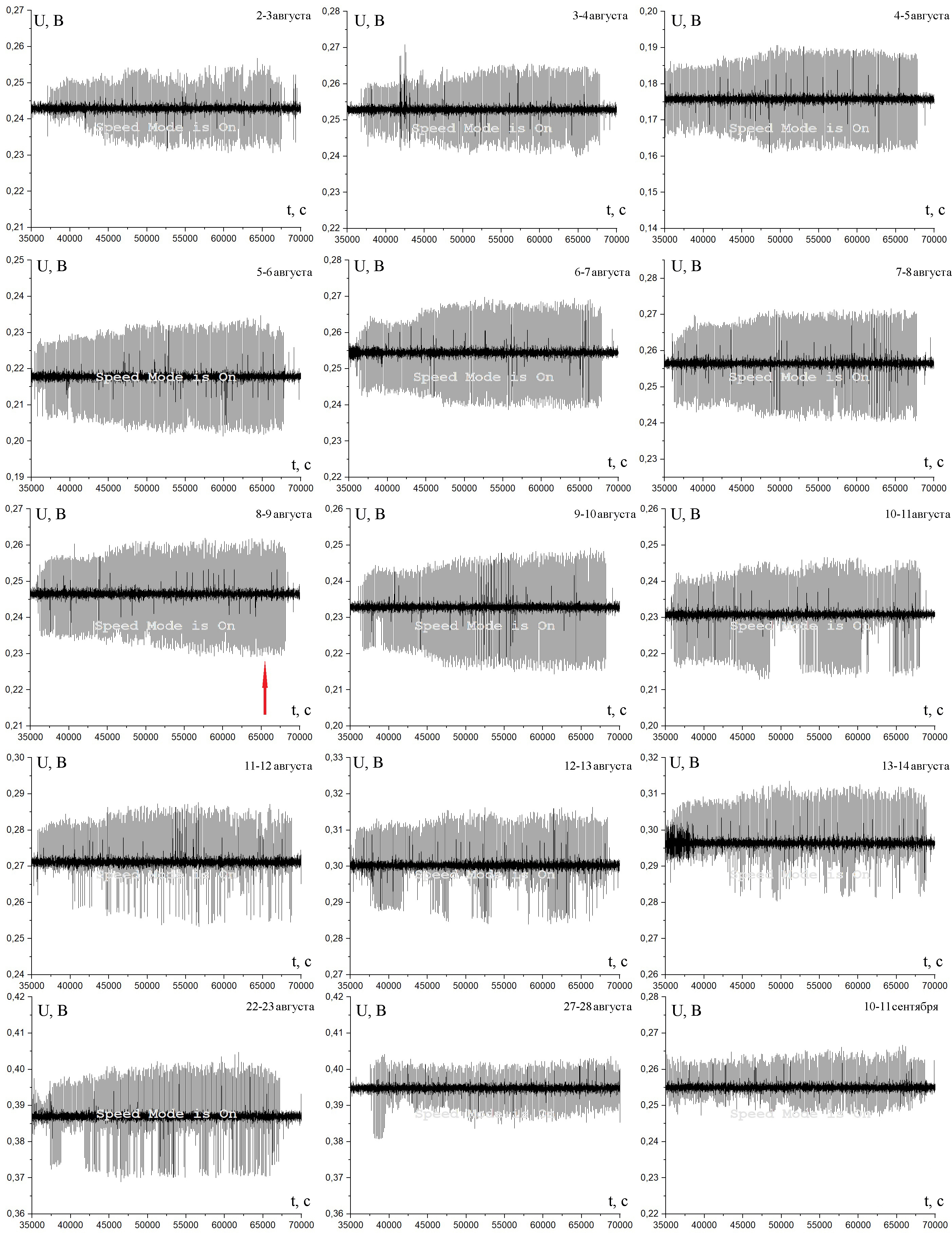 Для наглядности на рис. 8 и рис. 9 (продолжение рис. 8) мы покажем записи с канала NW-SE в “ночное“ время с 20 часов 45 минут до 6 часов 25 минут посуточно. На рис. 8 первые три записи из июня месяца, когда проводилась настройка аппаратуры, и данных для анализа практически нет. Однако на них видно, что в 20х числах июня сигнал очень слабый и нестабильный. Все графики сделаны в одном масштабе времени и напряжений для того чтобы было легче сравнивать (вся ось Y – 0,06 В).
