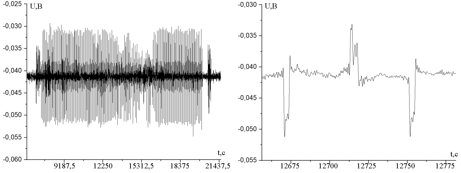 Мы зарегистрировали сигнал, похожий на японский GUV [?], который у них начинался по длительности от 20 секунд. С той разницей, что наши “гувоподобные” сигналы были короче, появлялись преимущественно в дневное время, шли небольшими сериями (максимум в несколько часов), имели смену полярности, а кроме того, регистрировались без какой-либо привязки к нашим сериям и землетрясениям (пример на рис. 12).